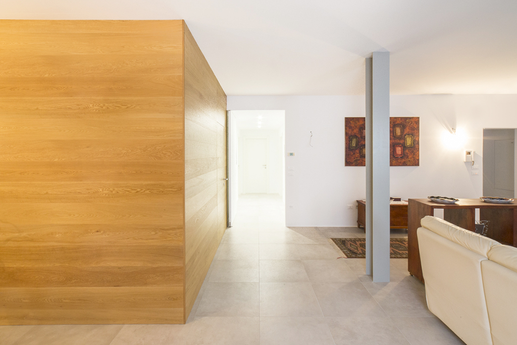 Un unico volume totalmente in legno, a nascondere la zona servizi dell’abitazione. Con delle doghe in rovere abbiamo rivestito la parete in cartongesso che divide il soggiorno dalla cucina e dalle scale che portano al piano notte.