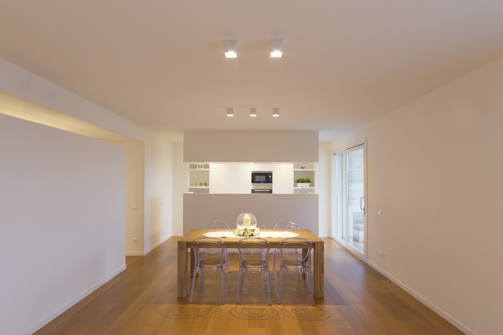 Una nuova cucina che riesca a collaborare con l’open space, ma che possa al contempo nascondere il naturale disordine di quando si fa da mangiare. Con linee pulite e finiture opache si può raggiungere questo obiettivo.